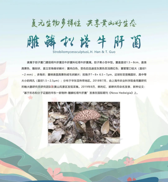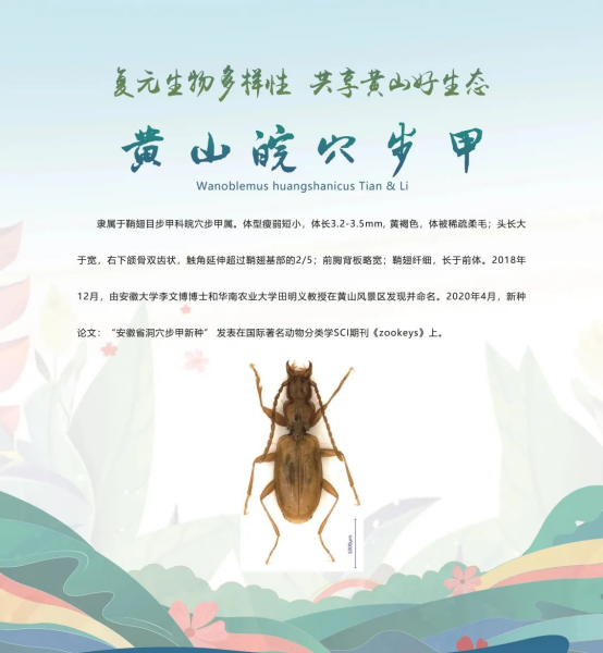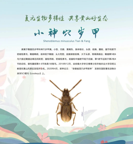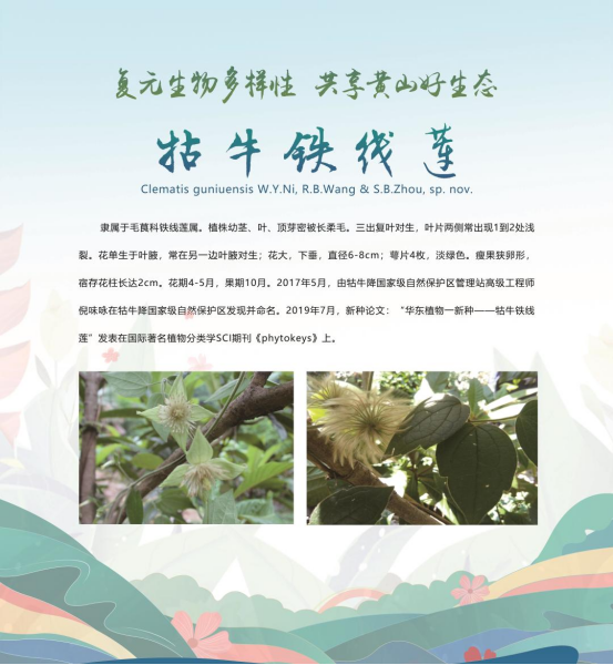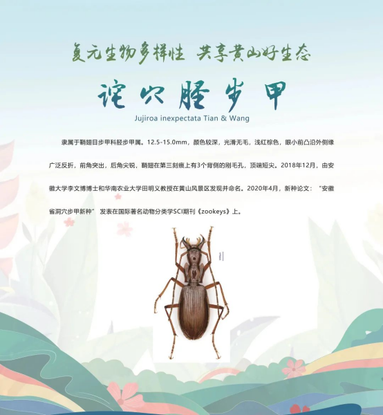 活动现场举行了黄山市13个全球新物种发布会。分别为黄家岭脊蛇,牯牛石豆兰、牯牛铁线莲、蔓生景天、黄山马蹄鳖、黄山新襀(jì)、小神穴步甲、黄山皖穴步甲、诧穴胫步甲、安徽麝(shè)鼩(qú)、雕鳞松塔牛肝菌、黄山松塔牛肝菌、东方牛排菌。
