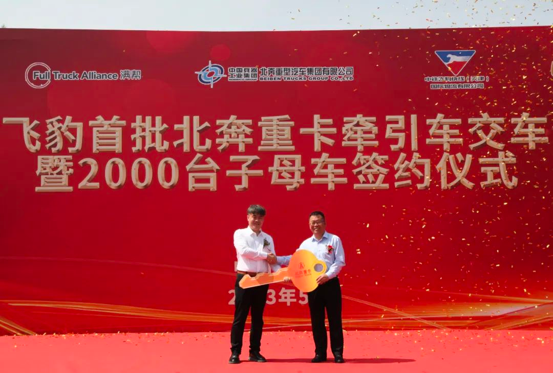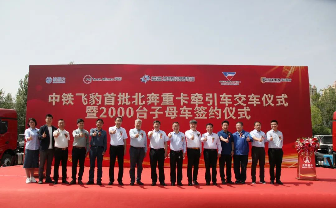 2023年5月27日,中铁飞豹首批北奔牵引车交车暨2000台子母车签约仪式在北奔重汽创新研究院内举行。此次仪式的成功举办是北奔重汽与中铁飞豹、所托瑞安、满帮集团、敏思达等合作伙伴强强联合,充分发挥各自在技术、资源、信息等方面优势,共同谋划,推动产业链协同,为地方经济和物流行业的高质量发展贡献力量。